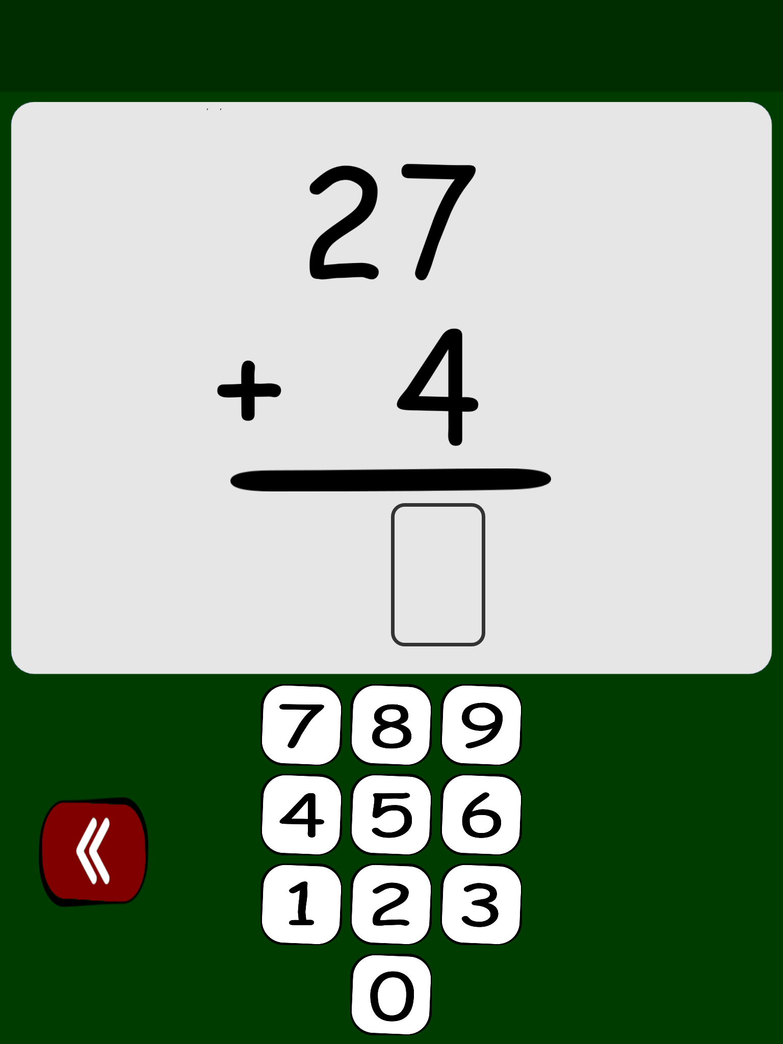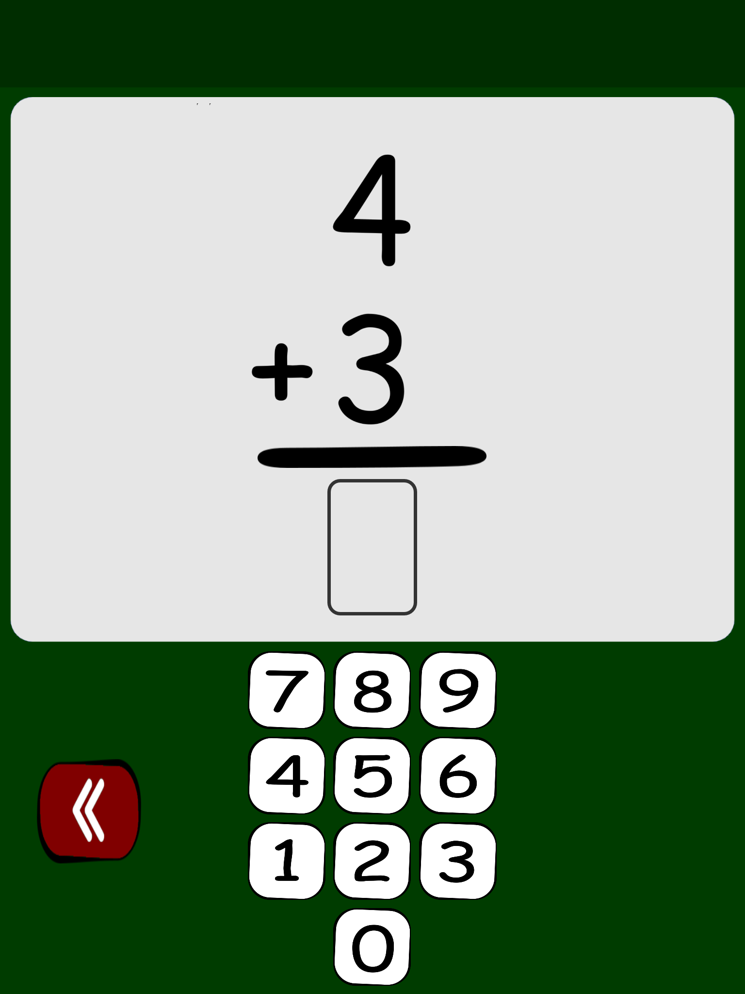Next is a typical addition problem. In training mode, the answer in each digit must be correct to proceed. When the correct answer is present, the next problem is automatically presented. The student can exit at any time by tapping the back button.