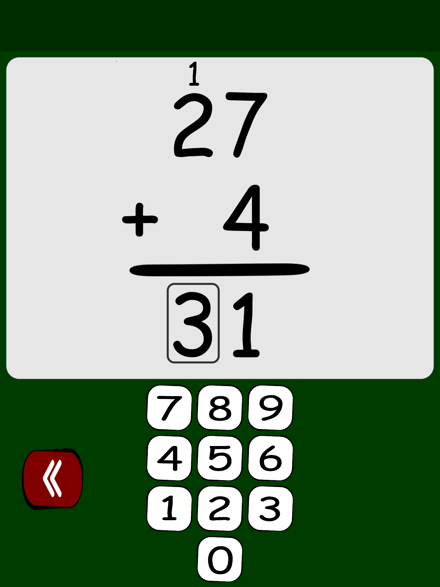 The carry notation is made visible by tapping the numbers in the top row. For example, in the above problem the 1 above the 2 is made visible by tapping the 2. Tapping the 2 again will hide the 1. This will work for all digits except for the rightmost digit. For some problems, when there is a carry but no digit in the first operand, tapping in the empty location where a number would be will accomplish the same thing.