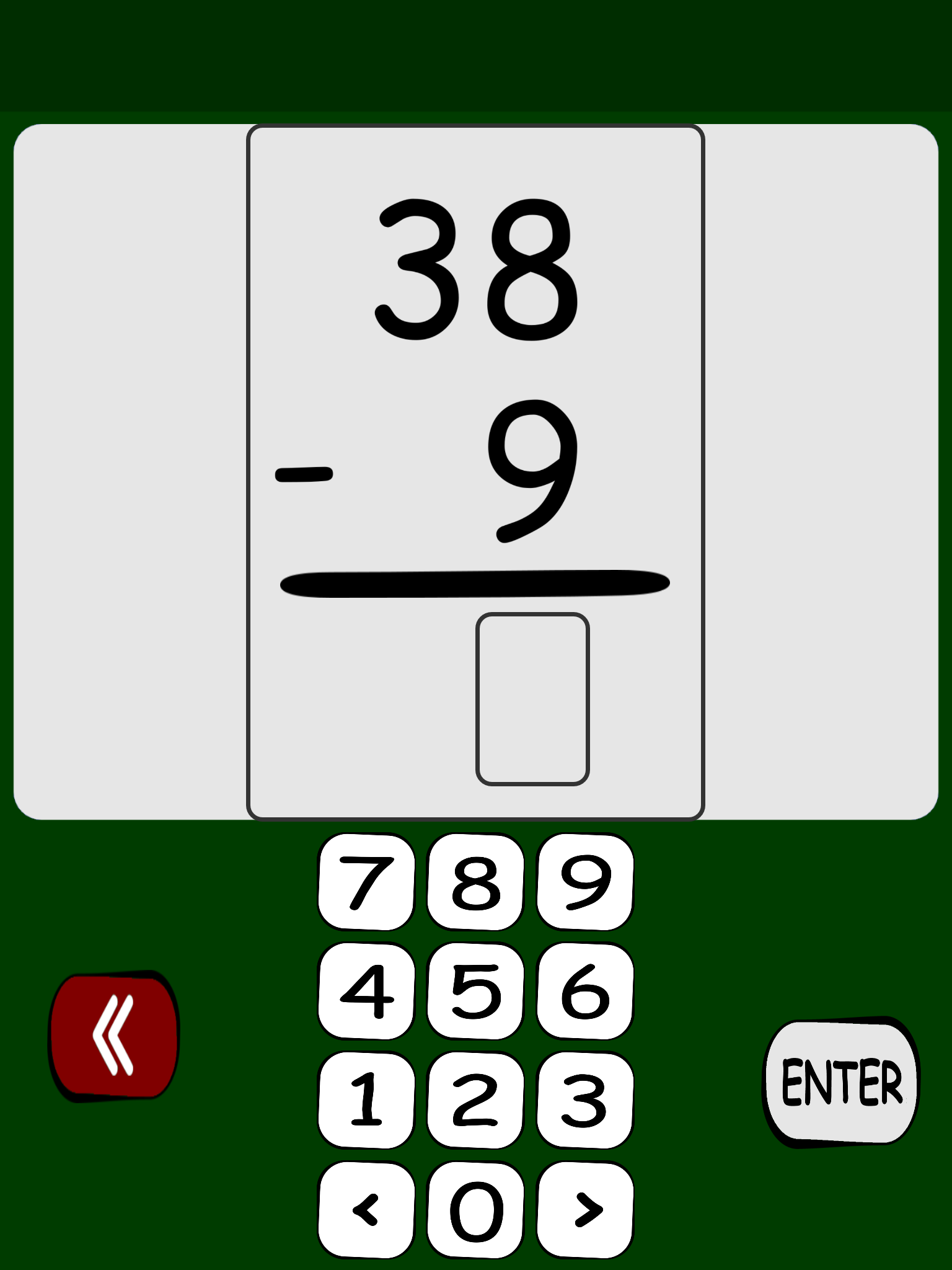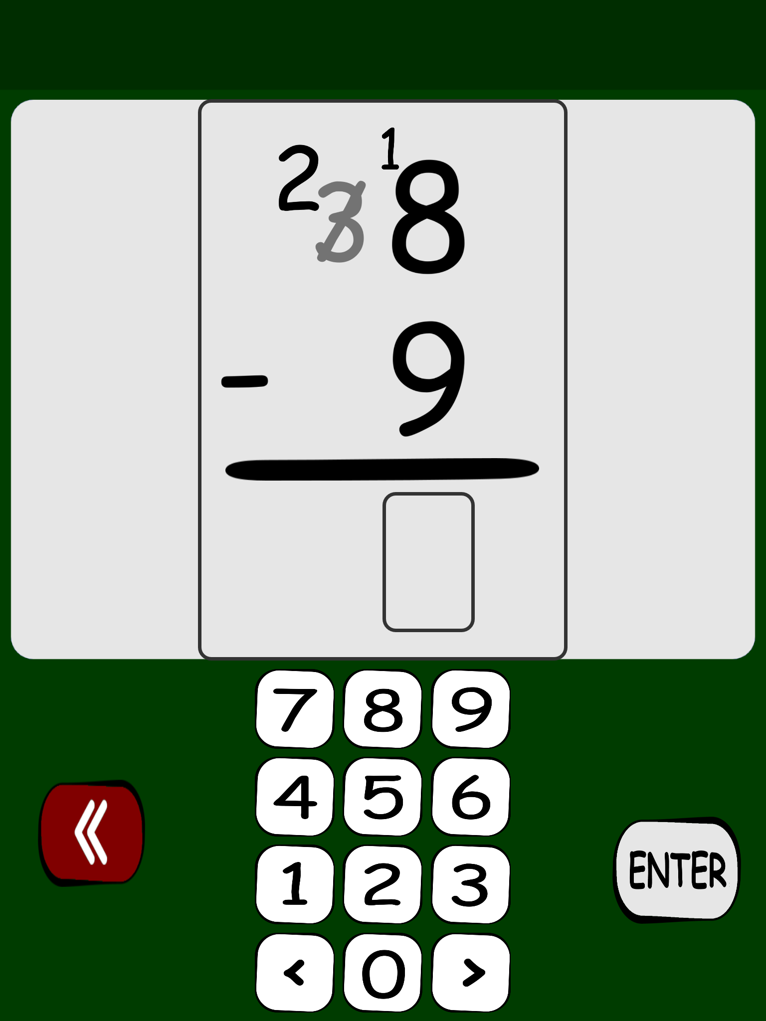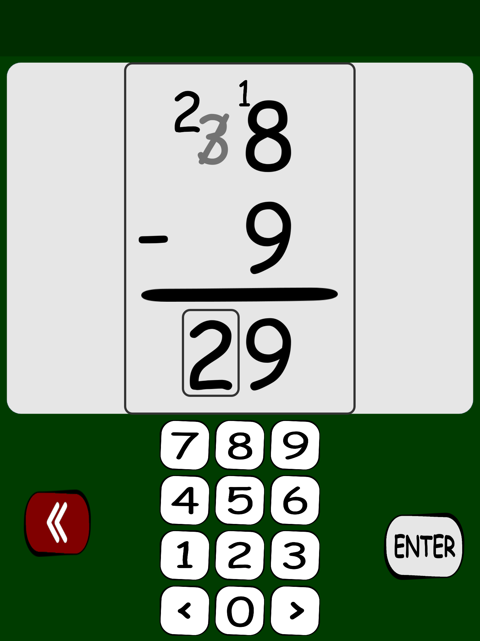 The borrow notation is made visible by tapping the numbers in the top row. Tap on the number from which borrowing is necessary. For example, in the above problem the borrow notation is made visible by tapping the 3. Tapping the 3 again will hide the notation. This will work for all digits except for the rightmost digit.