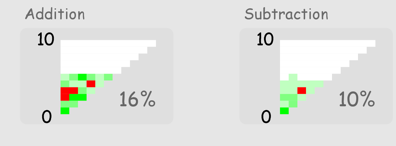 These progress indicators provide a visual for each operator. For addition, the numbers on the left side indicate the answer, or sum, for a specific problem. The horizontal position of a given cell indicates the first operand, which is the top number of a problem in vertical form.
