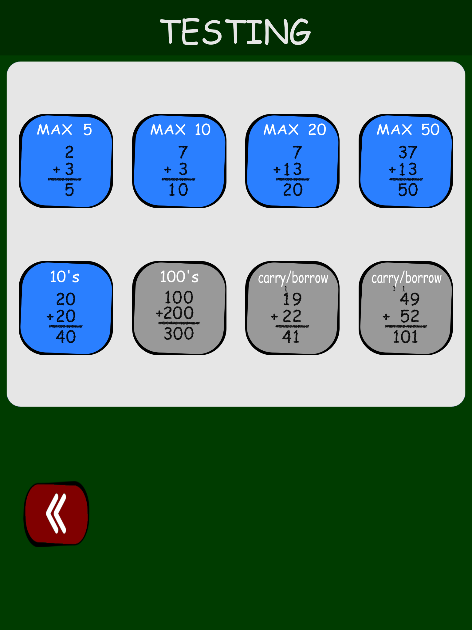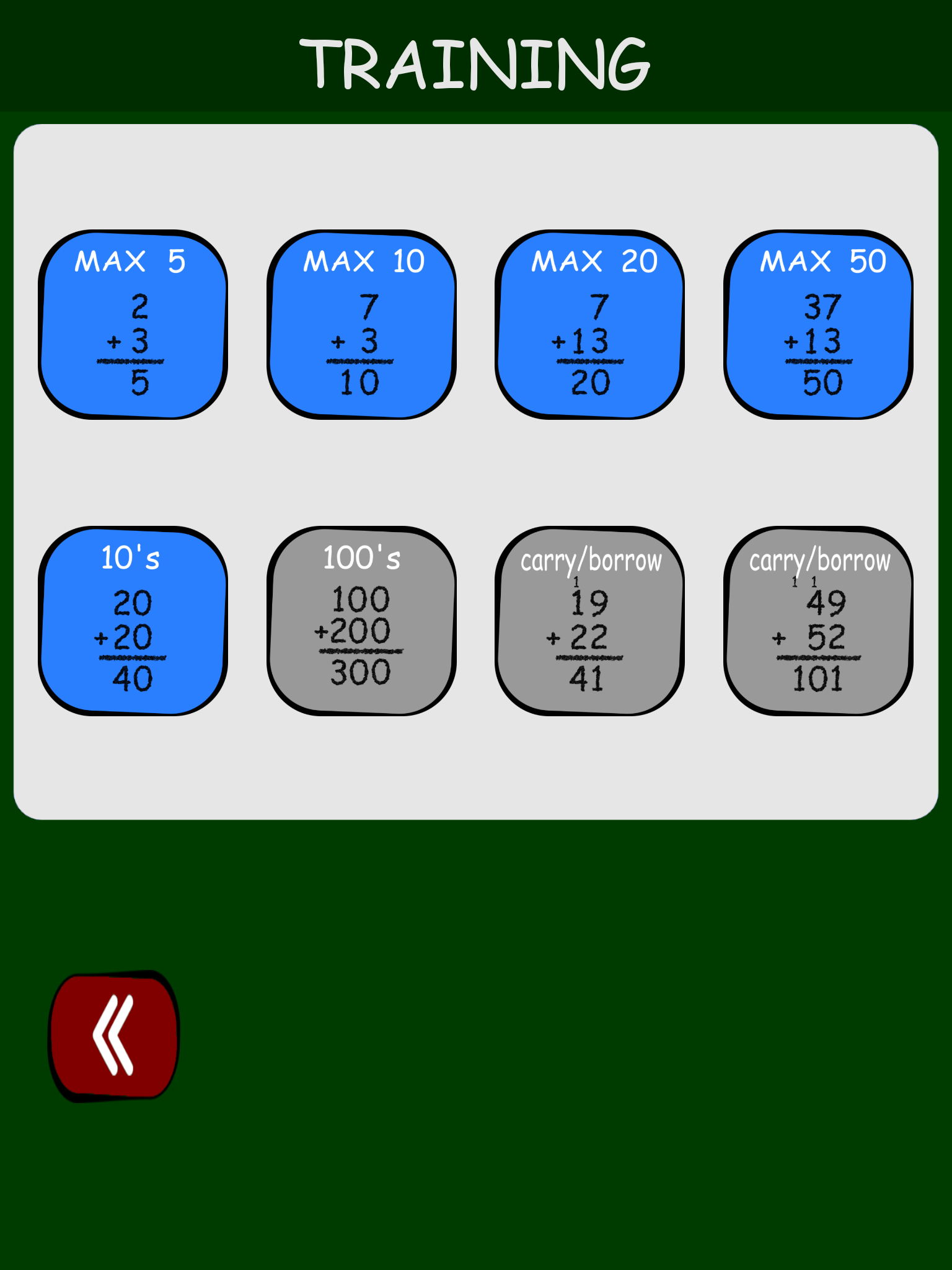 This is the training activity menu. On the top row, the only difference is the maximum sum for addition or , in the case of subtraction, the largest first operand. Choose the maximum to enable repetition within a range suitable to the student's level. The bottom row has other offerings -- addition and subtraction with 10s is the only one available in the current demo version.