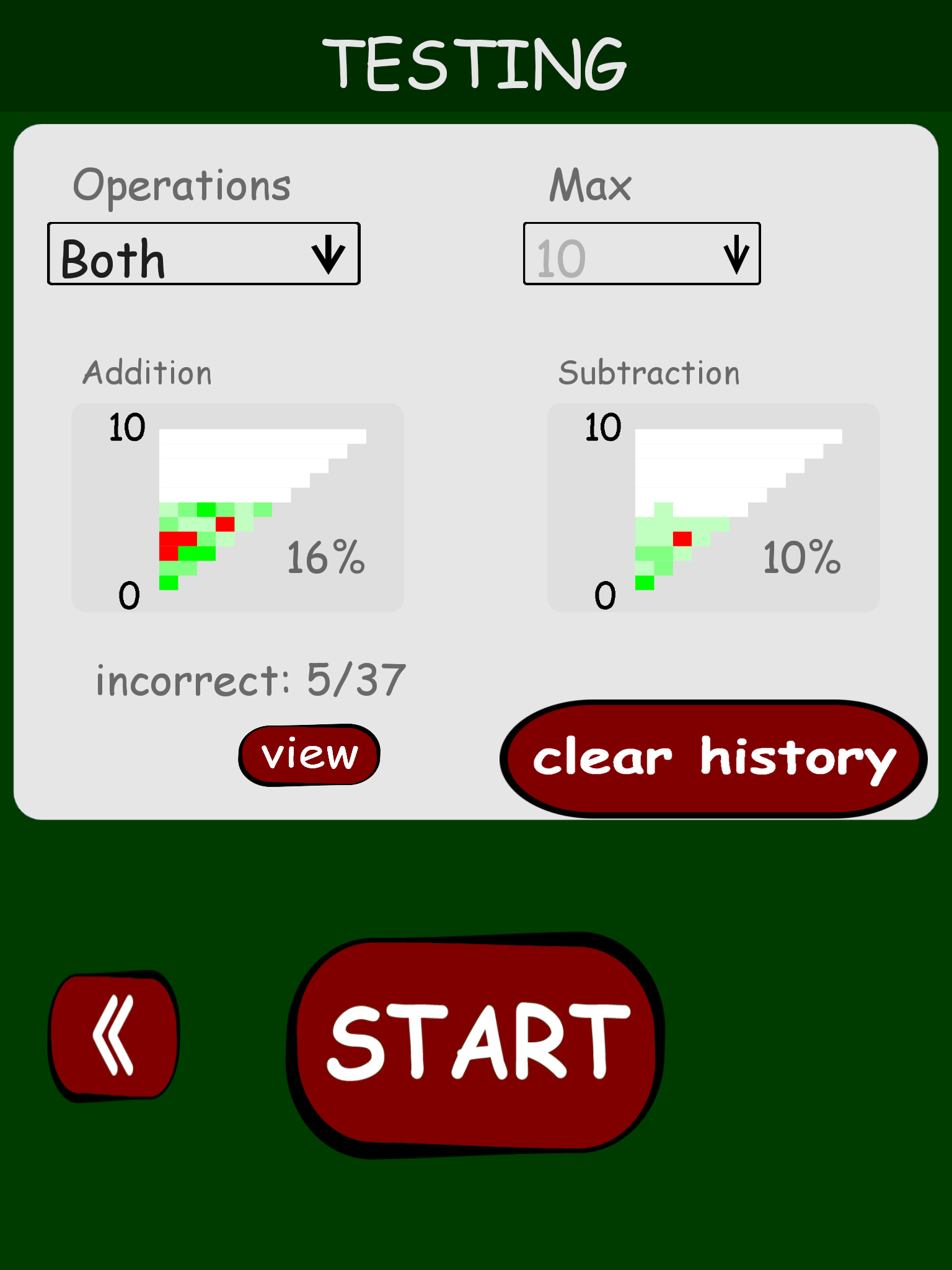 This is the start screen for the selected testing activity. In testing mode, the problems answered incorrectly can be reviewed by tapping the 'view' button. Clearing history will clear testing data only -- training history will not be deleted.
