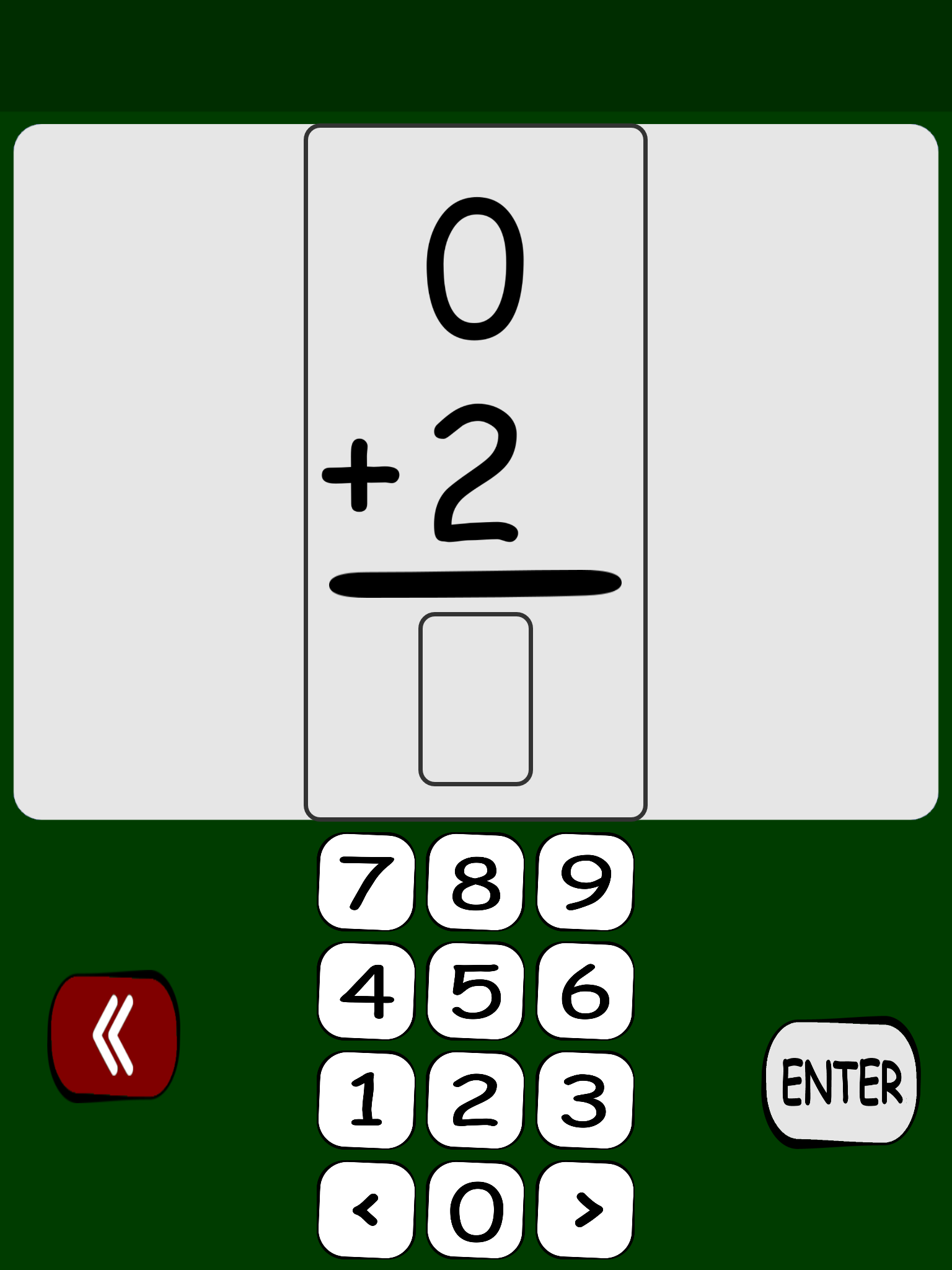 Next is a typical addition problem. In testing mode, the answer is submitted when the 'enter' button is tapped and the next problem is offered. There is no indication as to whether or not the answer is correct. The arrow buttons control the cursor location.