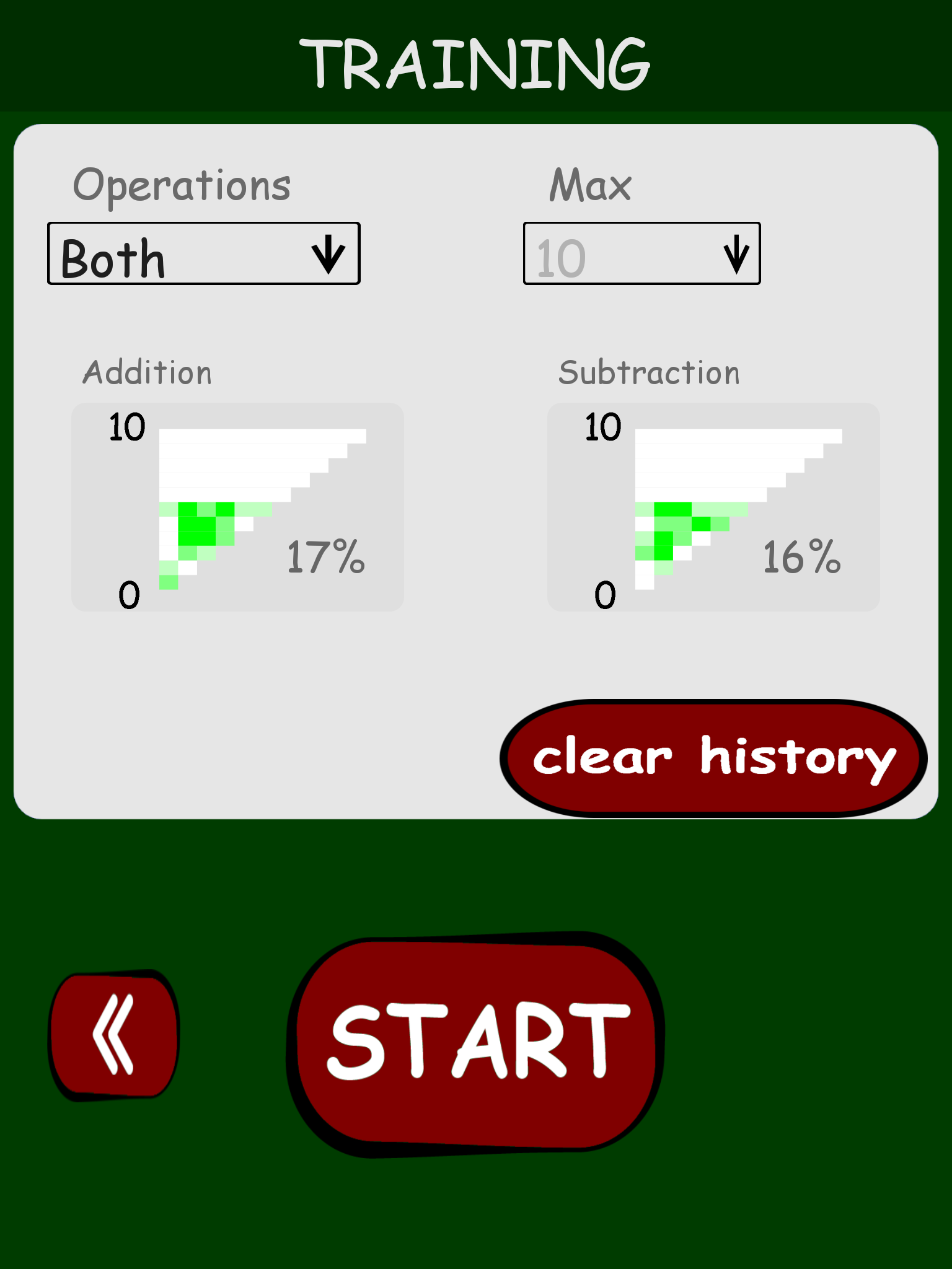 This is the start screen for the selected activity and is pretty much the same for all training activities. The operations to be presented are selectable -- addition, subtraction or both. Progress is indicated graphically for both operations.